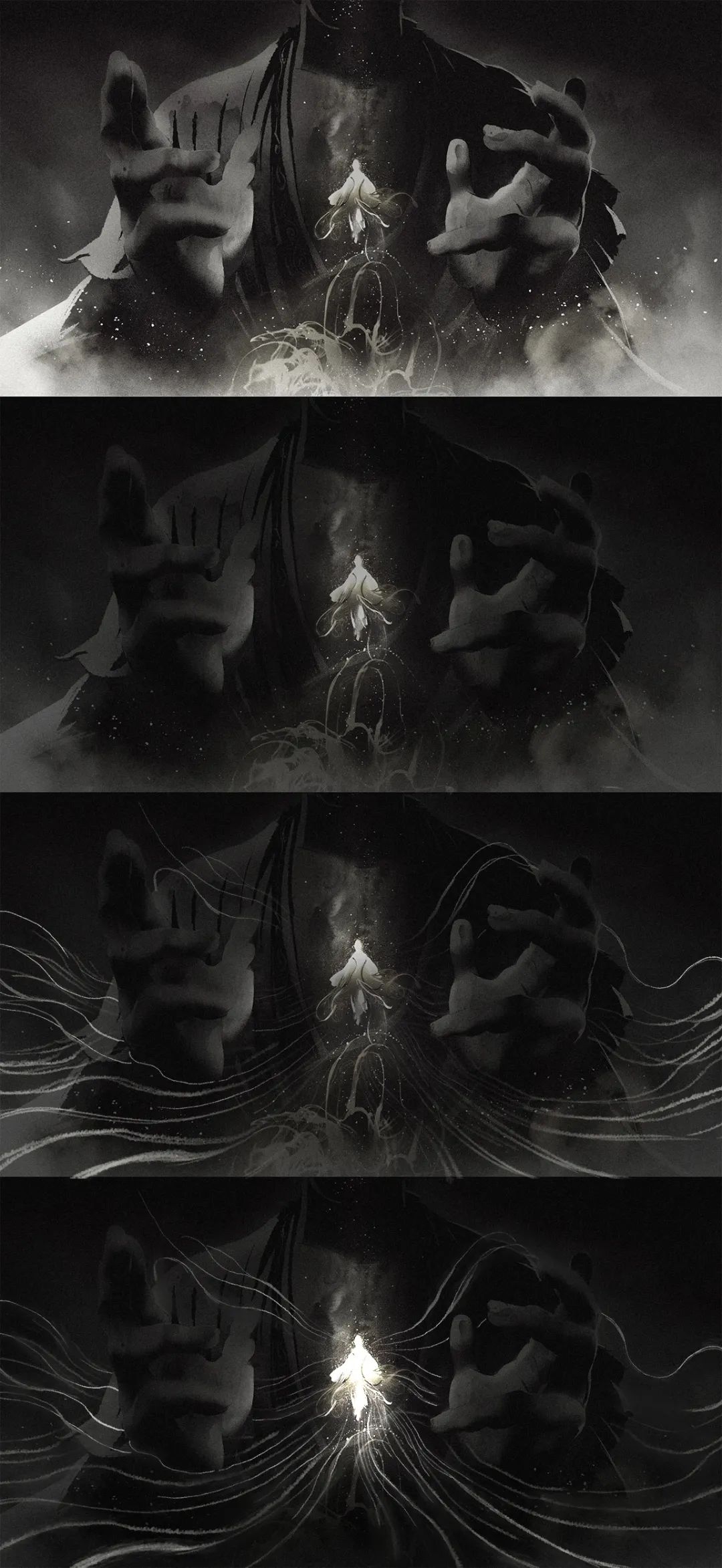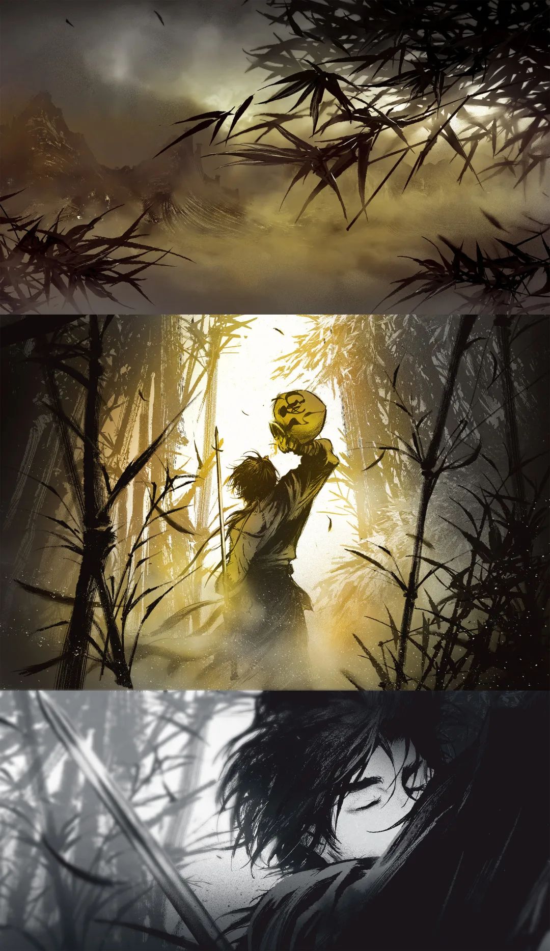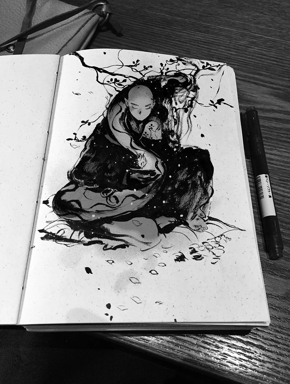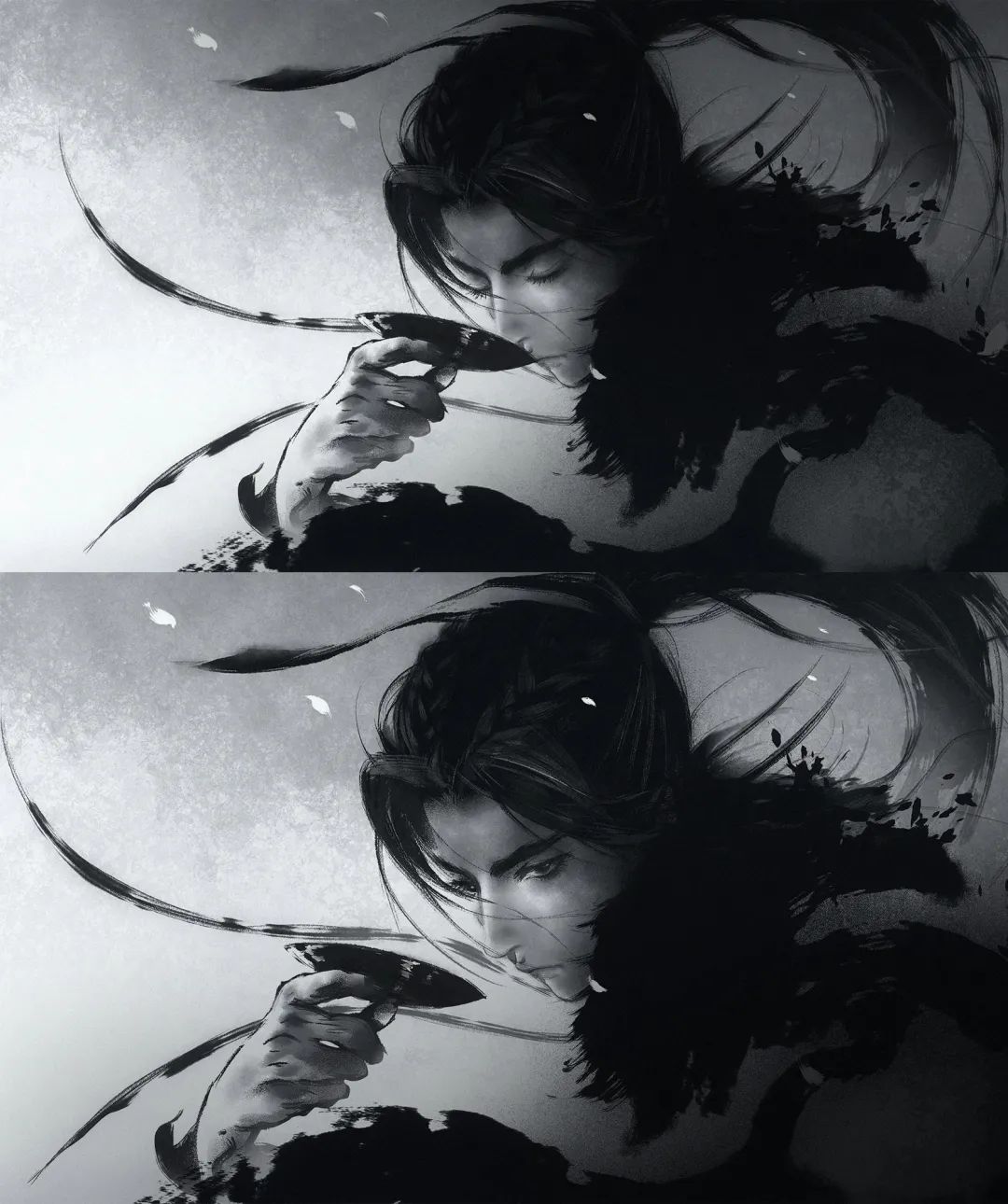 截至18年,錢憶畫得最多的就是黑白水墨畫,代表著他內心水墨色的江湖與水墨色的少年。