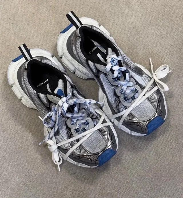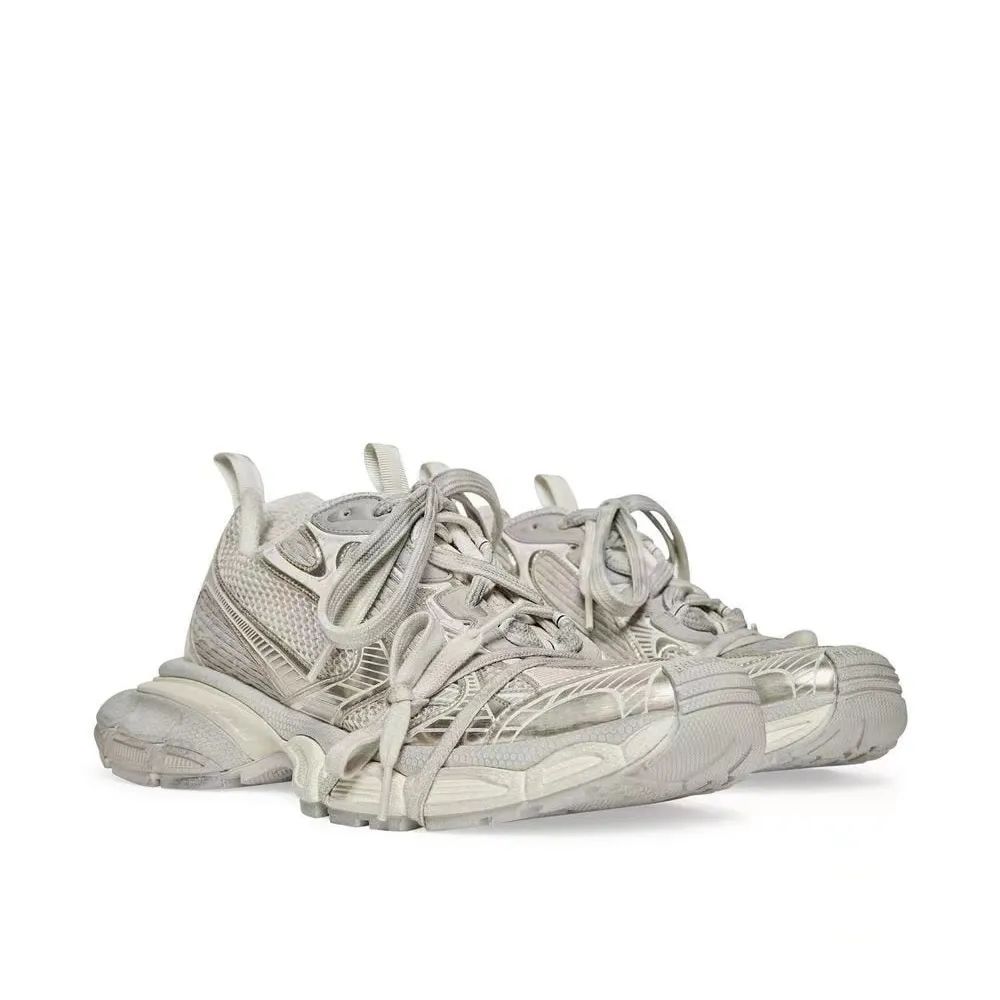 當(dāng)然除了“米奇德比”Steorid,今年最讓TEDDY期待的球鞋一定是3XL。即使在23春夏秀場(chǎng)那泥濘的T臺(tái)都沒有掩蓋住它的光輝,作為近期BALENCIAGA少有推出的橫向放大造型的運(yùn)動(dòng)鞋。Demna將千禧年代的運(yùn)動(dòng)跑鞋重新演繹,加入了其標(biāo)志性的設(shè)計(jì)語言。而在秀場(chǎng)上就十分吸睛鞋帶綁帶設(shè)計(jì),配上夸張的鞋跟,擴(kuò)寬鞋底打造出的極致的A字形外觀讓它能夠適配當(dāng)今多種大熱褲型,而比往年更加輕量化的重量也讓它在未來“爆款”的潛力增添了不少。