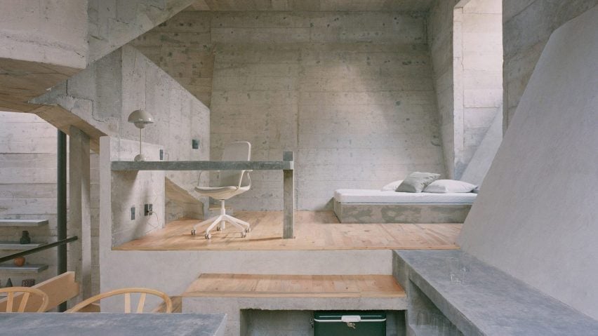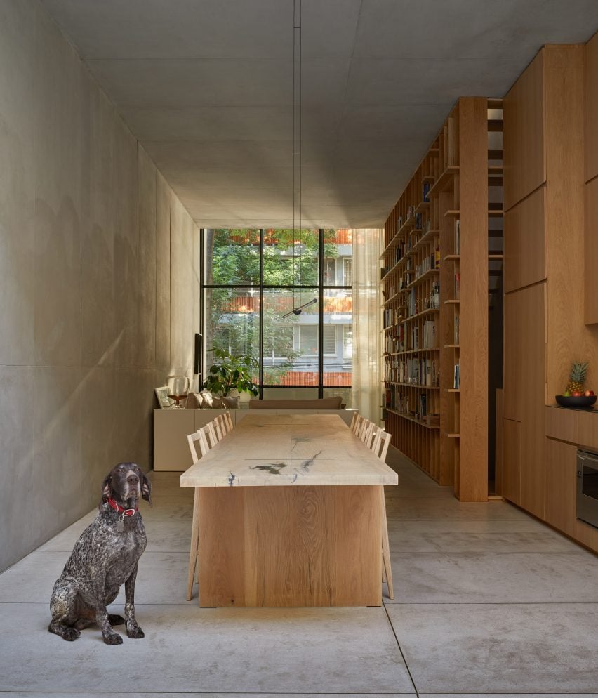 在室內,粗糙的混凝土裝飾與美國白橡木的細部形成對比,其中包括一張長餐桌和一段樓梯,樓梯的踏步嵌入一個巨大的書架中。