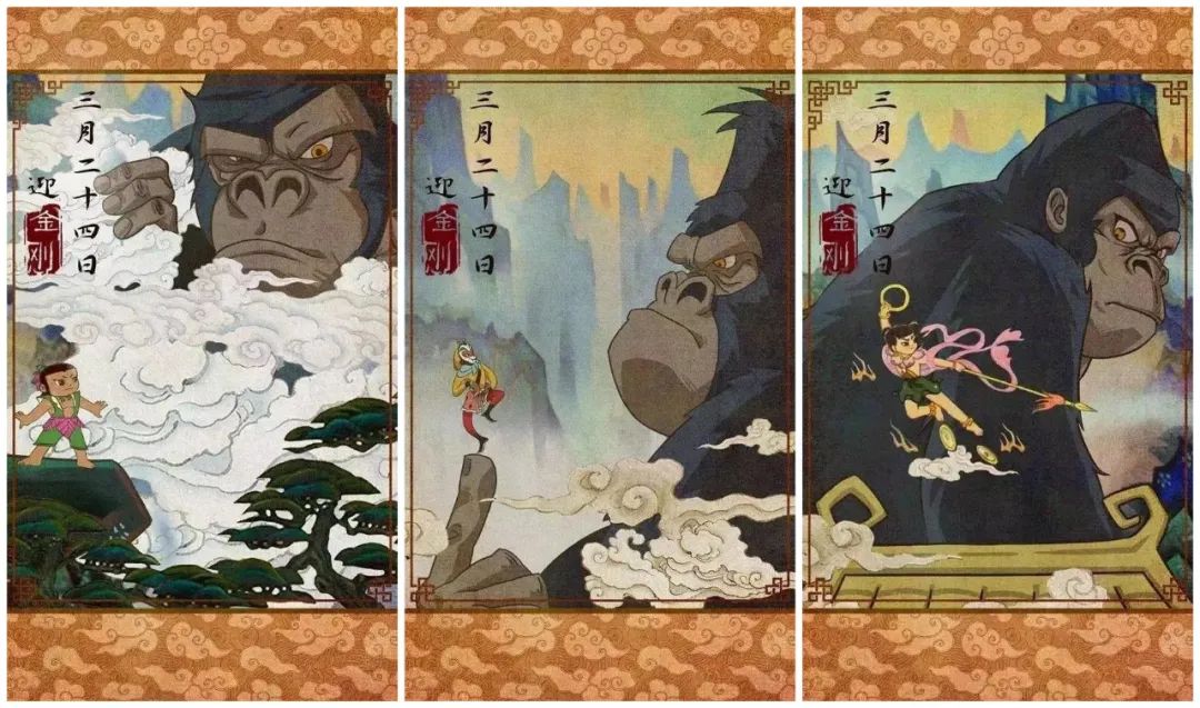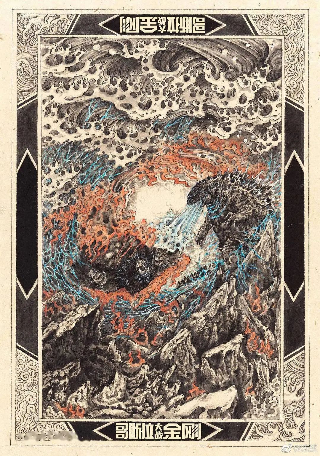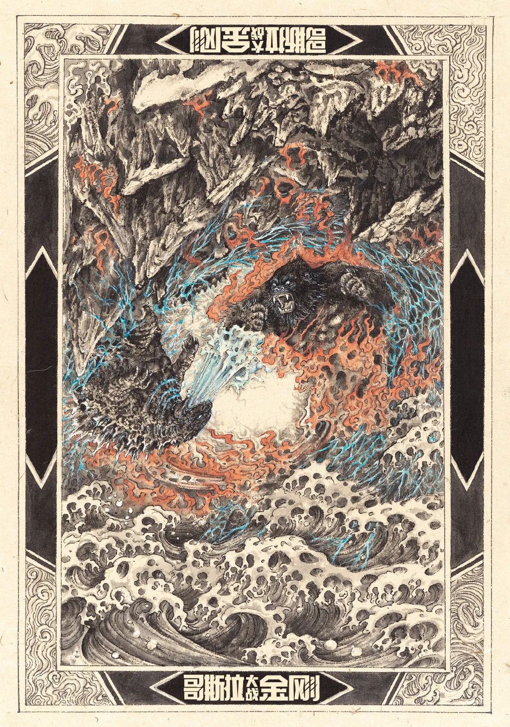 「陰陽水火」版中國風海報,由藝術家沈延繪制,通過陰陽的概念,巧妙的展現出哥斯拉和金剛之間的終極大戰。以紅藍兩色來凸顯激烈場面,無論你正著看還是反著看都可以。