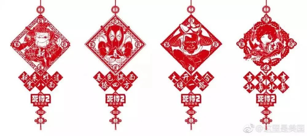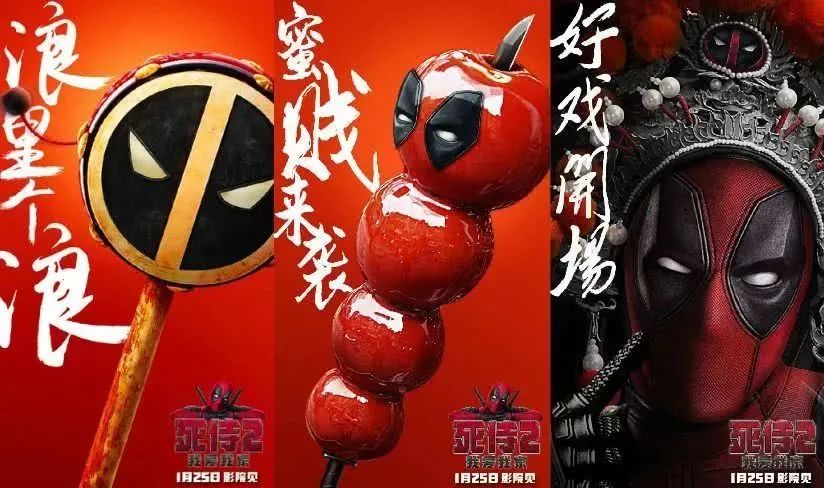 海報融入了中國傳統元素,糖葫蘆、撥浪鼓、京劇臉譜,賤萌賤萌又喜氣洋洋的死侍。