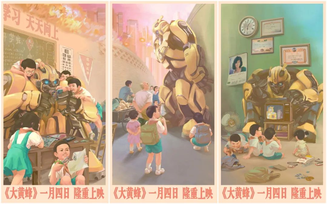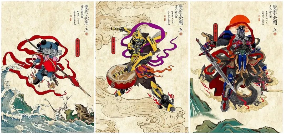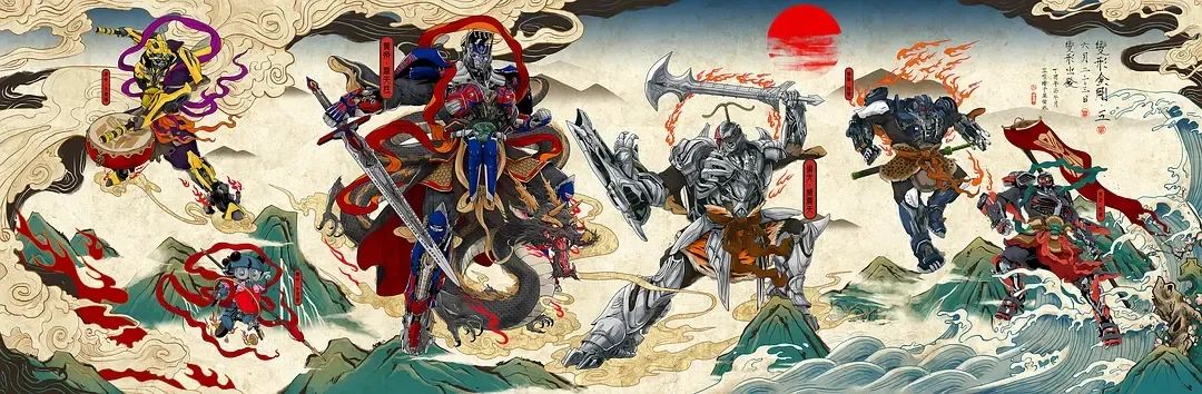 由插畫師“黎明daybreak”繪制,中國風長卷軸海報,每個變形金剛角色對應一個中國神話人物。
