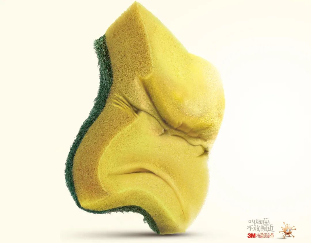 3M抗菌菜瓜布,海報上直接用了產品展示,但僅僅做了一個簡單的變形,卻讓受眾感受到它的抗菌效果。
