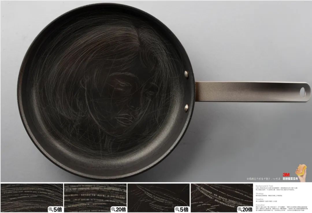 這也是創意的兩個關聯切入點,用刮痕的形式在鍋底勾勒出了媽媽的模樣,一方面向受眾展示了如果鍋頻頻被刮傷,那媽媽一定很傷心。