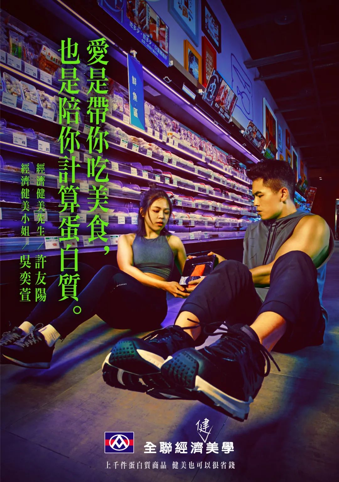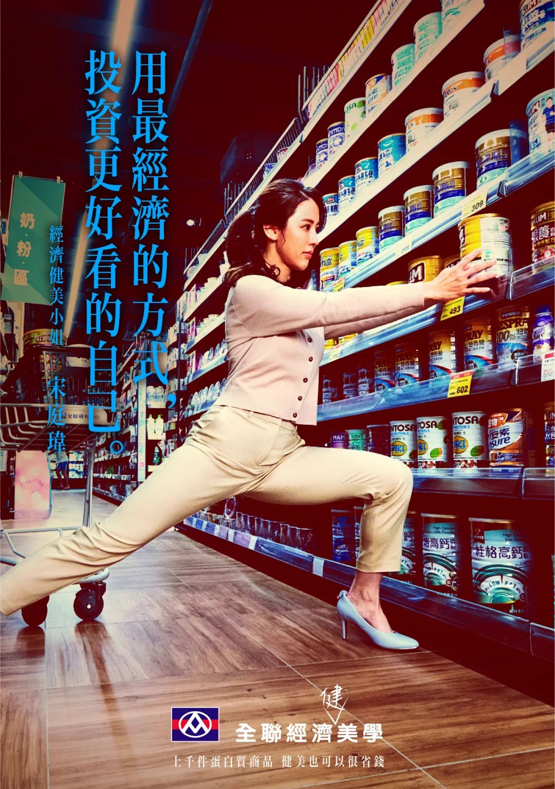 全聯經濟美學的分支創意。這一系列平面創意海報通過在全聯超市購物的動作與健身動作相結合,表達出了在全聯超市購物是一種更具性價比的健康活動。