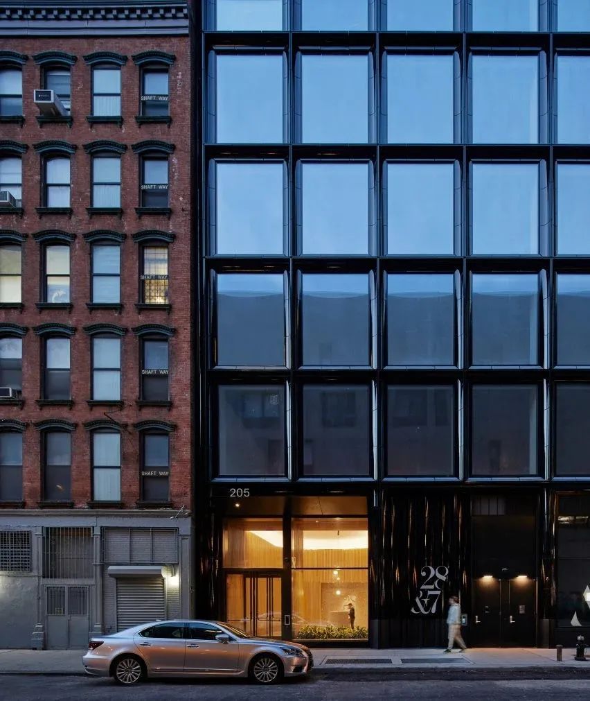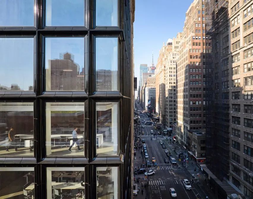 這是紐約第一個使用黑色陶土的建筑實例,陶瓷材料涂上黑色釉,然后拋光形成光滑、幾乎反光的表面。SOM表示,選擇這種材料是因為它與立面其余部分使用的透明玻璃“協調”。建筑的簡約外觀像是“完美定制的套裝”,隱藏了窗戶的鋁框。