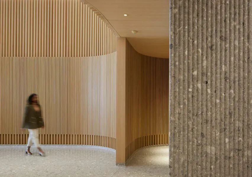 大樓的規模足以成為“以社區為中心的工作場所”,這種更小、更開放的安排可以吸引員工回到辦公樓。由于結構柱被集成到立面中,所以樓板是無柱的,在整個 8361平方米的平面上創造了一覽無余的視野條件。室內材料的選擇旨在營造“舒適和溫暖的感覺”,這一點在采用木材和水磨石瓷磚覆蓋的大堂區域尤為明顯。