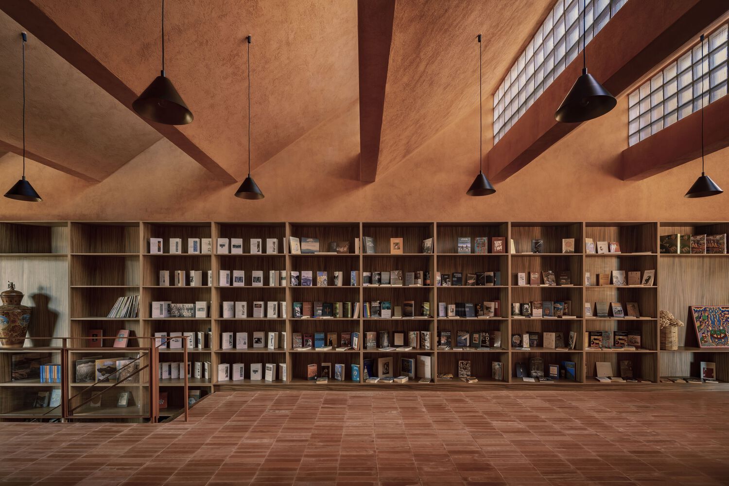 “在了解釀造龍舌蘭酒的過程時,形式和室內設計的提案基于一種被埋在地下的感覺,類似于某些類型的龍舌蘭酒的釀制過程。空間采用拋光混凝土和磚塊實現了泥土色調。從廣場的走廊只能隱約感受到龍舌蘭酒吧的溫暖光線。進入這家店后,一個裸露的磚拱廊圍繞著中央空間,揭示了吧臺。”