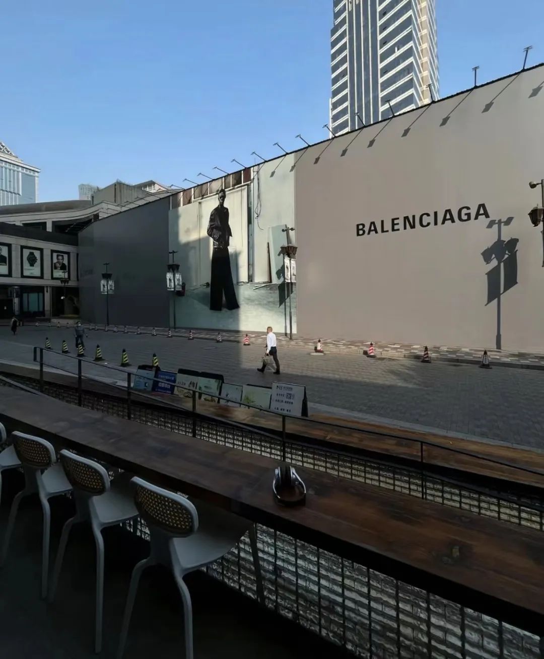 這個圍擋的后面,是巴黎世家在上海興業太古匯商場開設的新門店。這家門店占地近千平,建成后或將成為巴黎世家在中國最大的零售門店。空前的門店面積為圍擋帶來了格外開闊的外立面,配上巴黎世家簡潔的 logo 和充滿高級感的模特畫報,毫不費力地營造出一種異國情調。因此,這個圍擋吸引了大批年輕人前來打卡,更是成為了時尚潮人們展示風格的「街頭秀場」。