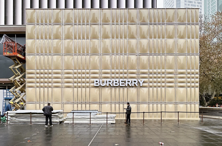 如此前 LV 的老花 logo 圍擋,BURBERRY 的格紋泡泡圍擋,都是在圍擋上還原并放大了品牌的經典印花,并利用富有變化的顏色和工藝,在圍擋開闊的外立面打造出有著強烈品牌調性和視覺沖擊力的品牌圍擋。這些圍擋也一度在社交媒體收獲巨大的關注,傳播熱潮也從線下延續到線上。