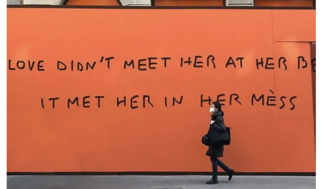關于愛馬仕圍擋,此前在社交媒體刷屏的米蘭愛馬仕新店的圍擋,更是做出了另一個維度的品牌溝通——在鮮明的愛馬仕橙背景上,有且只有一句標語:Love didn’t meet her best, it met her in her mèss,意思是,愛也許不會在你光芒萬丈時出現,而會在你狼狽不堪時降臨。據時尚媒體 VOGUE Business 求證,這句話并非愛馬仕的廣告語,而是藝術家 Pietro Terzini 的街頭創作。通過將 Hermès 巧妙地拆分為 her mèss,這一獨到的雙關語成功賦予了圍擋強調品牌屬性和傳遞情緒價值的雙重意義。