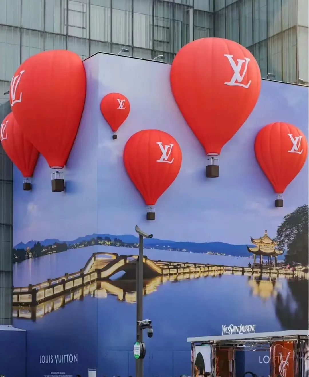 一個典型的例子是今年 3 月 LV 在杭州湖濱銀泰 In77 門店設立的圍擋。依托于西湖邊這一獨特的地理位置,LV 創造性將西湖景色作為圍擋背景,搭配上鮮明的熱氣球元素,找到了品牌旅行文化的在地化表達。