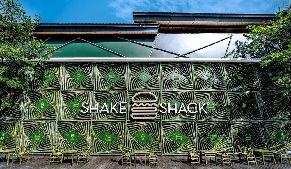 SHAKE SHACK 是品牌圍擋融入在地文化的另一個標桿,在不同的城市,都能看到 SHAKE SHACK 圍擋不同的創意表達,其中最為出圈的就是成都街頭兩層樓高的竹藝圍擋,由竹竿編織排列而成,充滿自然氣息的同時又形成了一種強烈的秩序感。