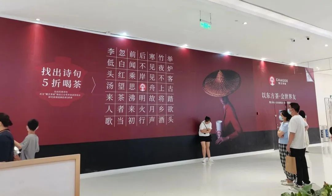 雖然不是所有品牌都如巴黎世家這樣,有時尚格調的加持,只需要露出一個 logo 便能引來大波人流;也不如前述的始祖鳥、Peak Performance?等品牌,能大手筆投入預算做藝術裝置,但還可以走 social 文案帶動線上傳播的路線,或是依靠新穎的互動體驗,搶先鎖定種子用戶。比如霸王茶姬在門店裝修時就發起了詩句互動,消費者在打亂的字中找出一句詩,便能享受五折優惠,通過前置發放福利,刺激用戶開業后到店消費。這樣的玩法,能在成本可控的情況下,為門店在前期就積攢起人氣。