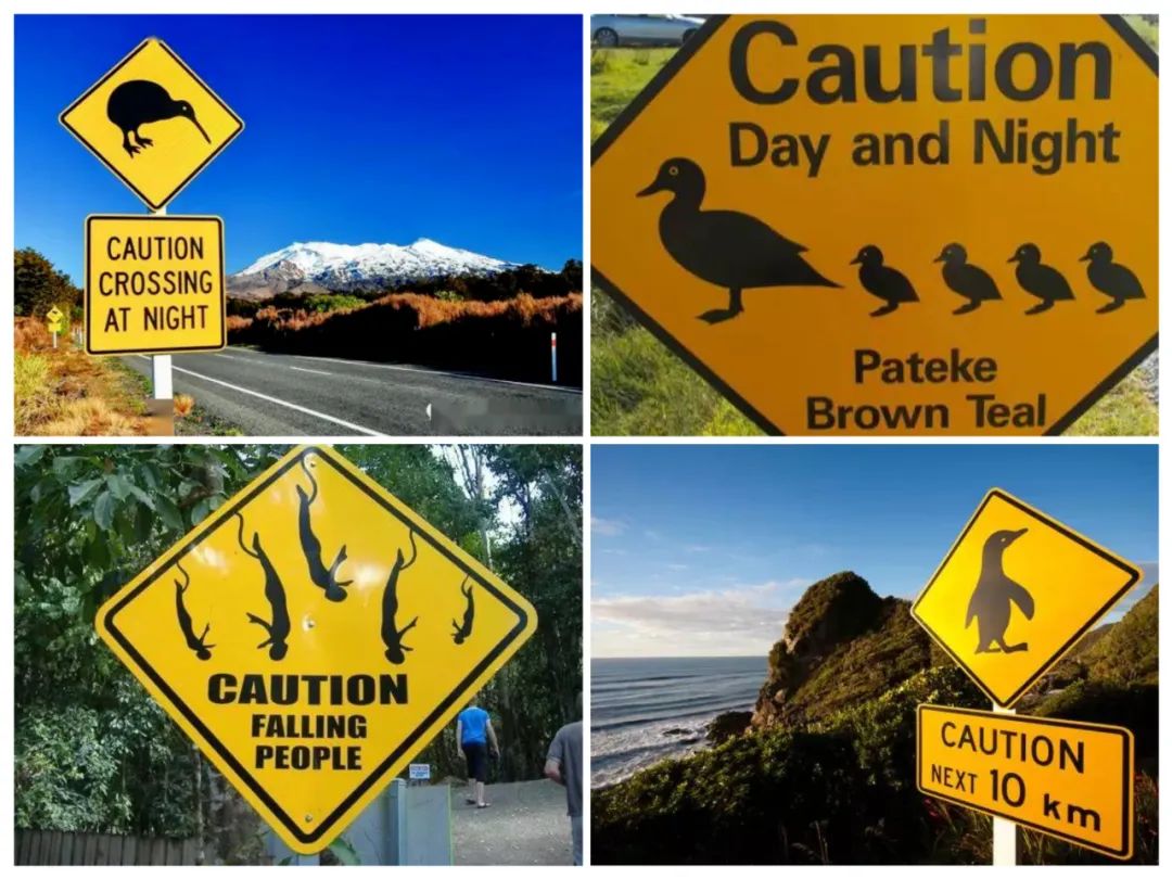 新西蘭提醒小心動物甚至“空中飛人”出沒的路牌,充分體現了當地的生物多樣性和極限運動的天堂