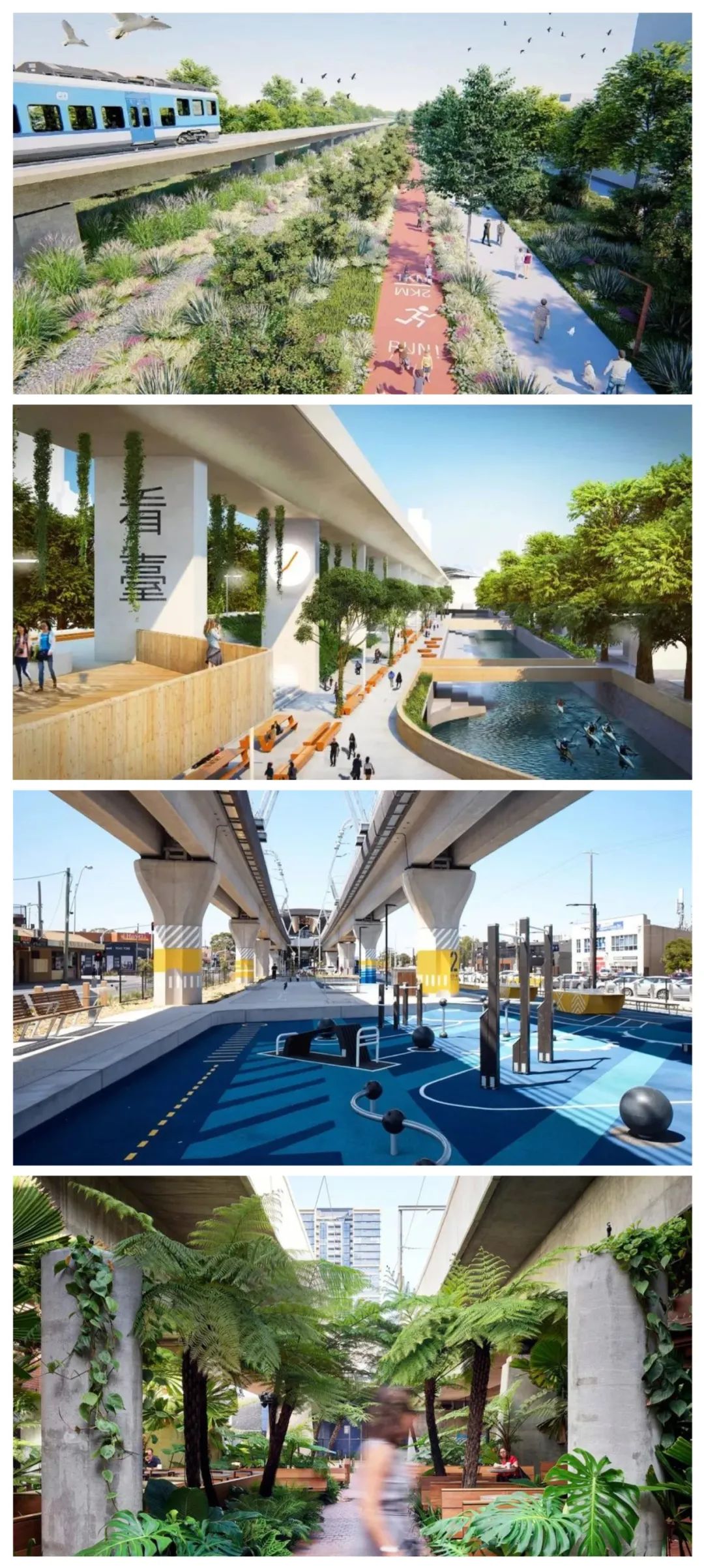 中國的京張鐵路遺址公園、臺中綠色長廊,澳大利亞的SKY-RAIL社區活動公園、費什巷鎮廣場等,充分利用了鐵路、高架下的線性空間創造具有多功能性、包容性和吸引力的社區景觀