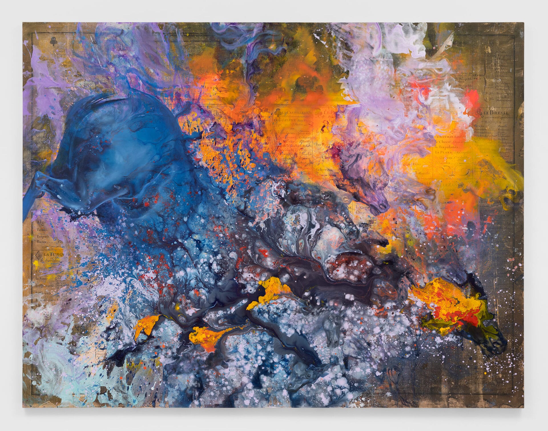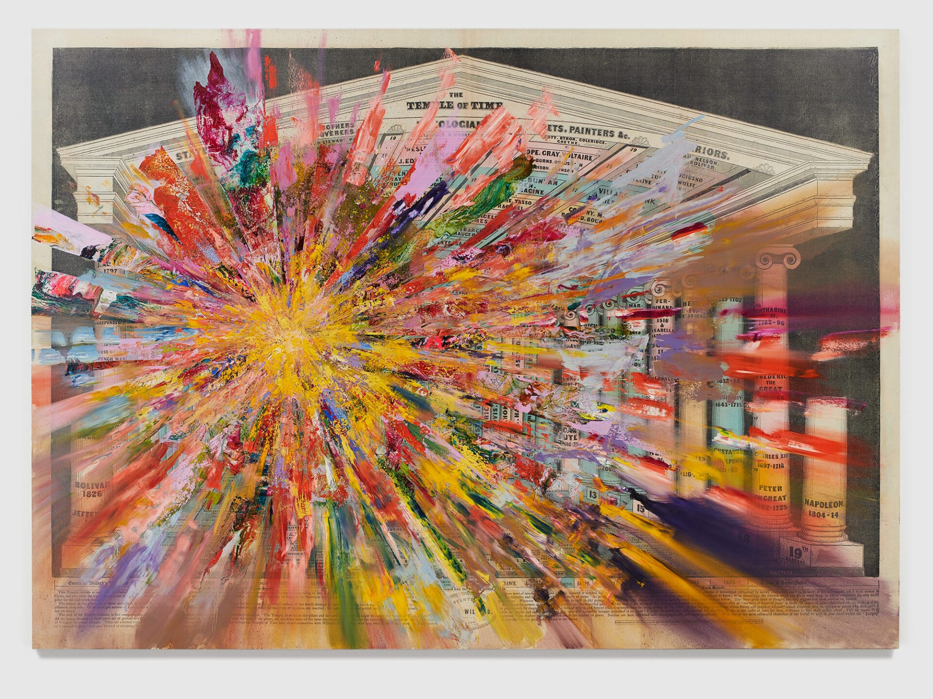 這位藝術家經常在地板上操作畫布,傾瀉和飛濺顏料,讓重力將顏料混合成斑駁的色彩。她將自己比作一種過濾器,通過這個過濾器傳遞并流入作品的巨大能量。這種活力體現在作品中,比如《無題(時間之殿)》,它在Emma Willard的19世紀石版畫上輻射出一個萬花筒,按時間順序記錄了世界的帝國主義歷史。