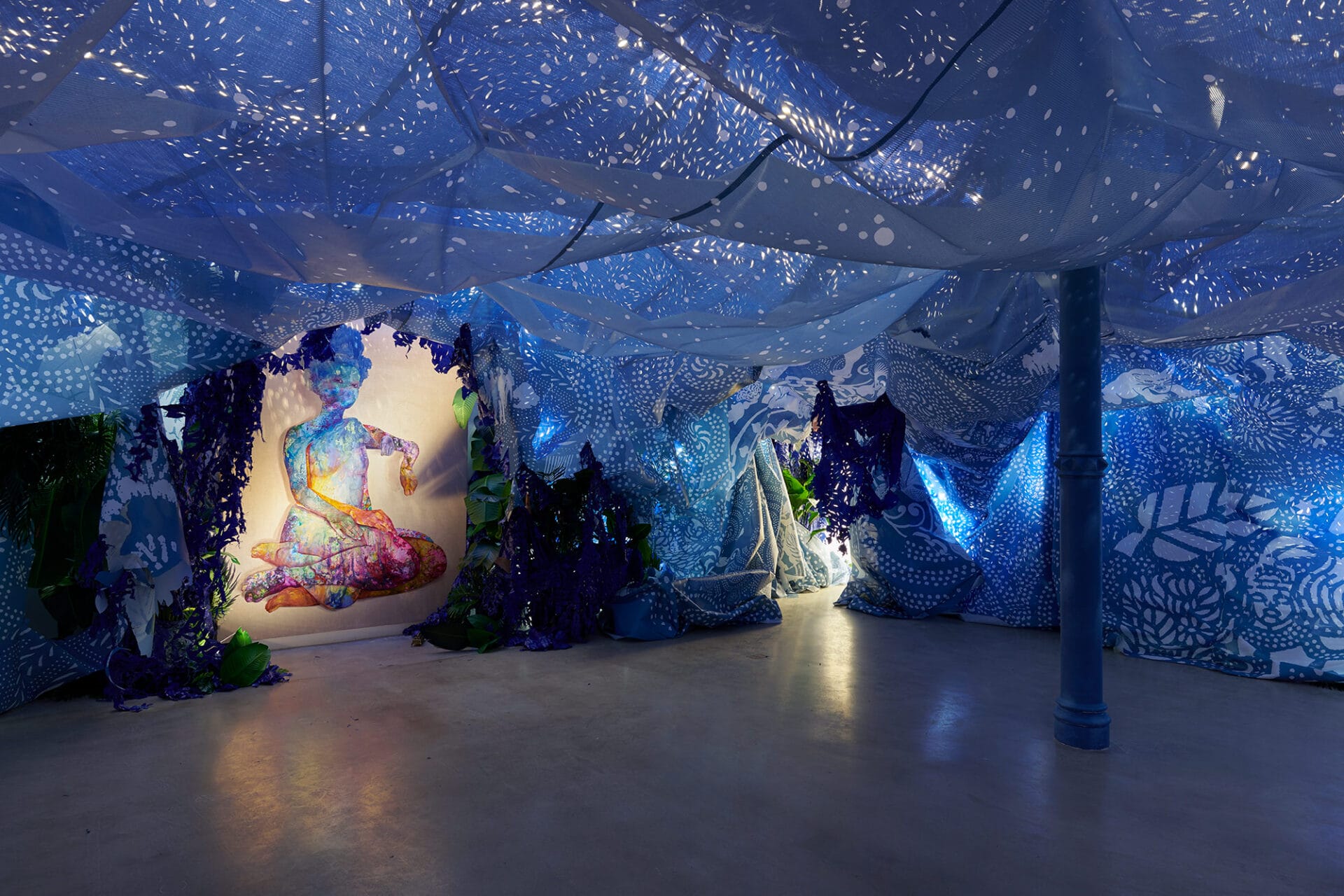 雖然在審美上令人陶醉,但每種鮮艷的顏色都充滿歷史和文化背景,Báez對她的調色板有著廣泛的了解:例如,藍色喚起了凱爾特戰士、圣母瑪麗亞和海洋的神靈。藝術家的沉浸式作品《Drexcyen chronocommons》在畫廊中展開起伏的天篷,用鈷藍、海軍藍和海藍色覆蓋整個空間。像Báez作品中的其他作品一樣,這件作品在魔幻的燈光下暗示著Drexciya神話,該神話說在跨大西洋奴隸貿易期間被扔入海中的非洲婦女的未出生子女現在居住在水下世界。
