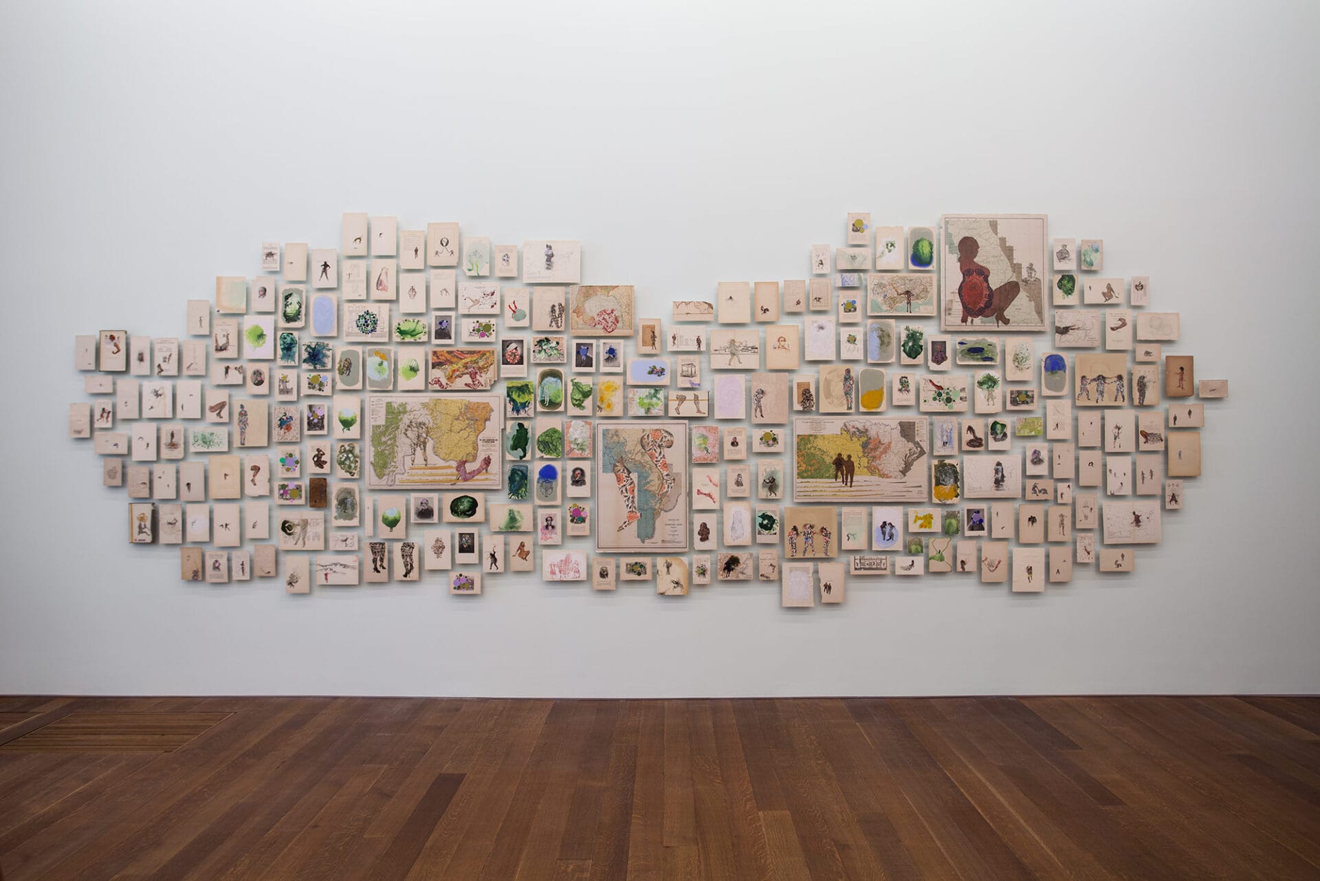 《沒有國家的人(2014-15)的細節,水粉、墨水和水粉畫,225 張舊書頁,106 1/4 × 252 英寸。奧里奧爾·塔里達斯攝