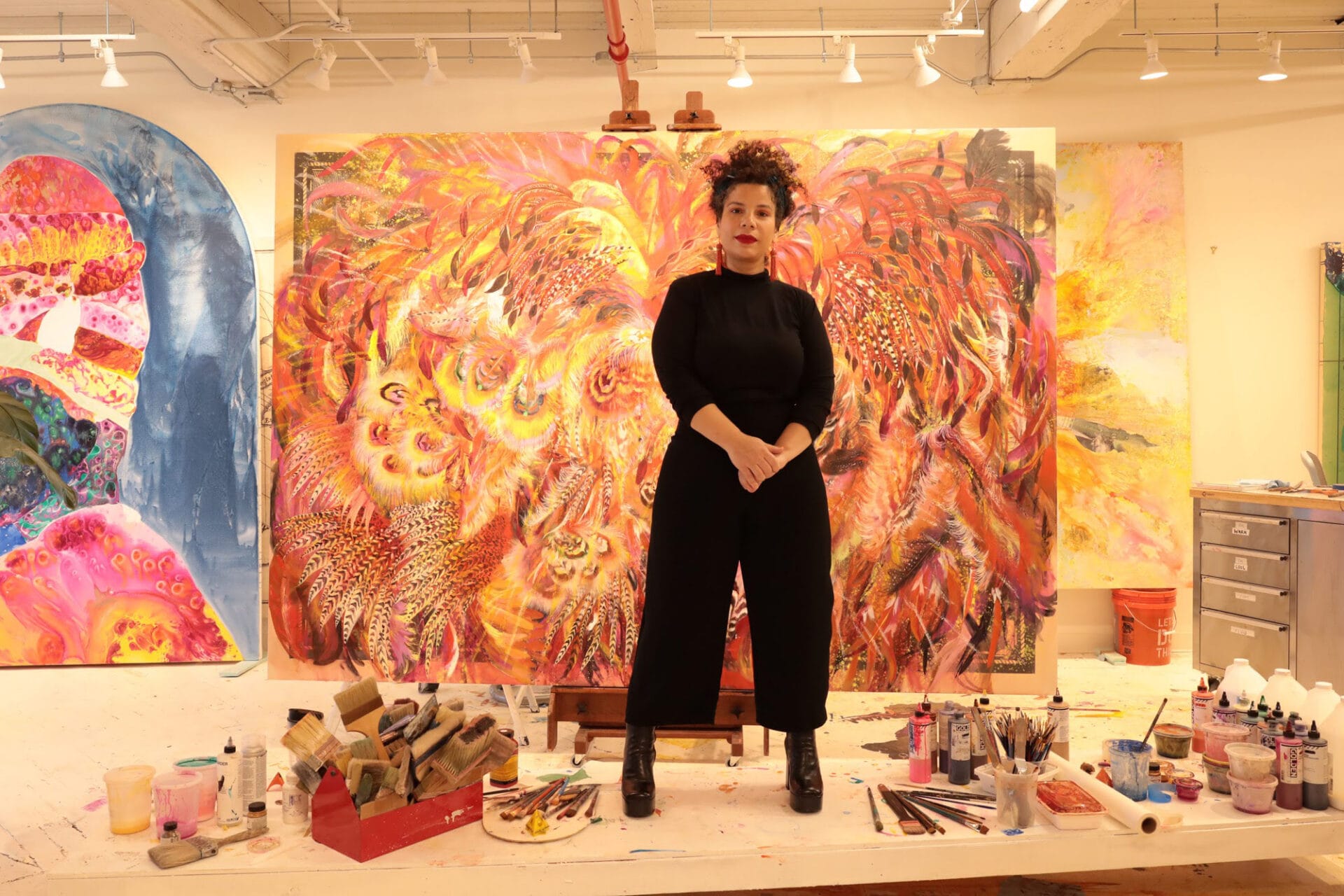 抽象對于Firelei Báez來說,就像是一張地圖的圖例,是一個旨在幫助觀眾導航她構想的世界的系統。她的作品,充滿水滴、飛濺和生動的色彩爆發,涌現于她所稱之為“幻覺”的地方,那里糾纏事實與虛構的殖民敘事開始瓦解。