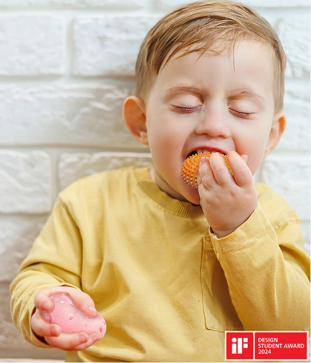 由于無法視聽,聽障盲童可能會因為對觸覺的高度敏感而對不同的質(zhì)地產(chǎn)生排斥。Touch’n taste 由大型觸覺模型和附在盤子上的小型觸覺模型組成,用于對食物的質(zhì)地進行分類。兒童可以通過用手或舌頭觸摸這些觸覺模型來體驗不同的食物質(zhì)地。通過重復這一過程,兒童將能夠僅通過觸覺推斷新食物的質(zhì)地,從而克服對質(zhì)地的恐懼。