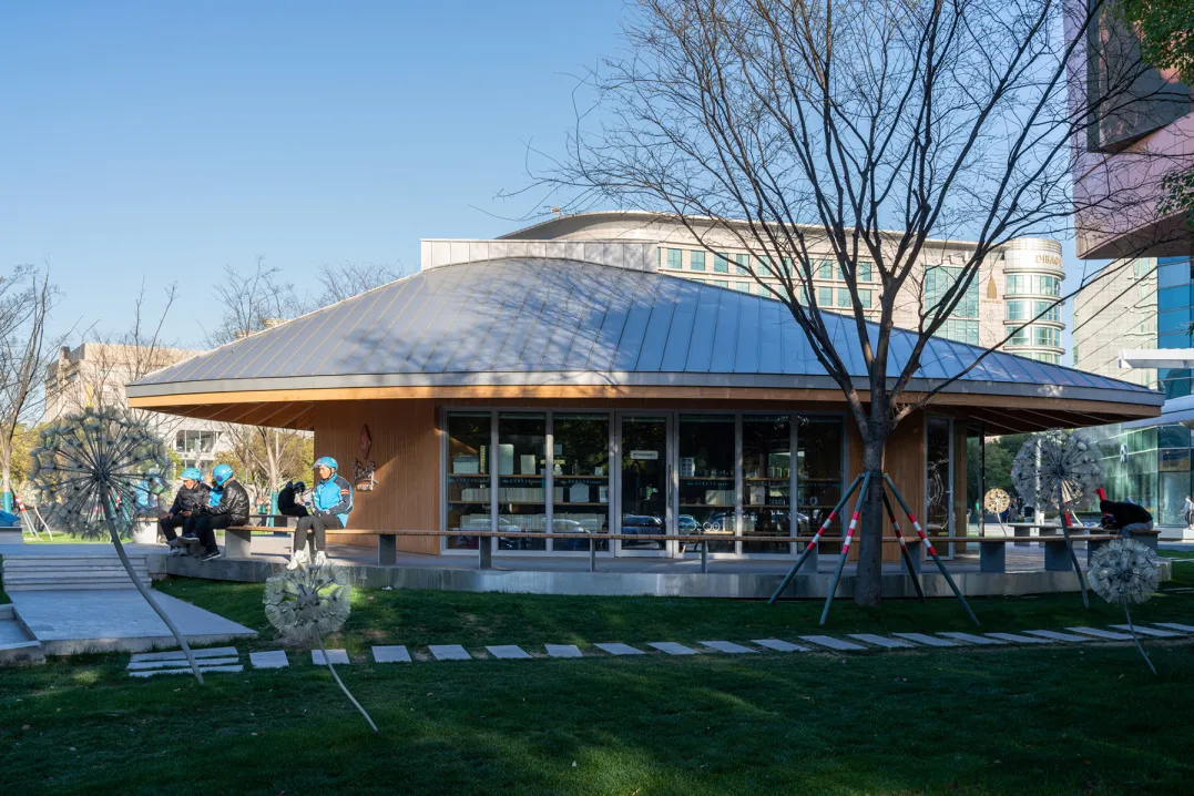初心驛·萬象黨群服務站位于上海虹橋鎮,在大型商場前的綠地里安放了一個亭子形狀的公共建筑,外形俏皮,屋頂外挑有3~4米,廊下布置了長凳,外賣騎手們可以在這里??啃菹ⅰ?/p>