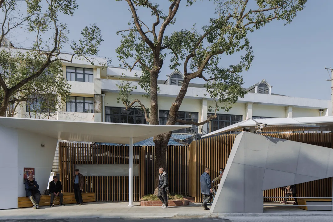 上海華東師大一村小區入口,加設了一個空間,白色鋁板經過兩三次折轉,外形像一把曲尺,為進出的居民、快遞外賣員、上班族等,提供了一處可以稍事休息的溫馨場所。