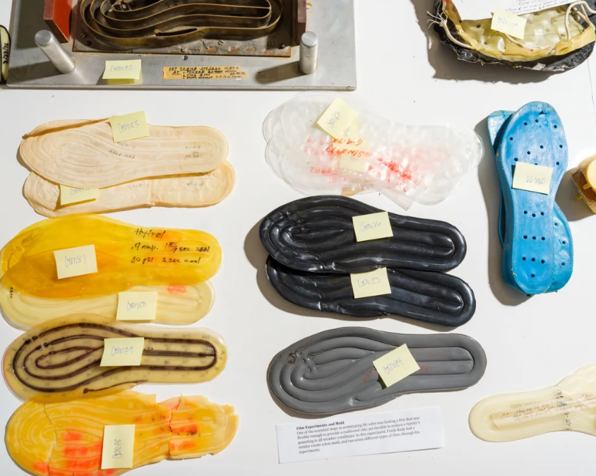 DNA藏有成千上萬的圖紙、原型、運動鞋和服裝,還有一支專門負責核實耐克歷史的檔案管理員團隊。這個地方不僅僅是一個歷史存儲庫;Adamson表示,耐克的設計師和合作者也積極利用DNA豐富的資源來構思新設計。在那里,他能夠深入研究一些從未發布的Air Force One原型和配色方案,以及第一款Air Max鞋的原始庫存,這款鞋的透明鞋底是由航空工程師Frank Rudy設計的。