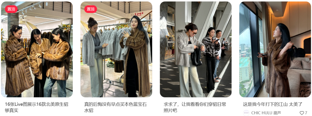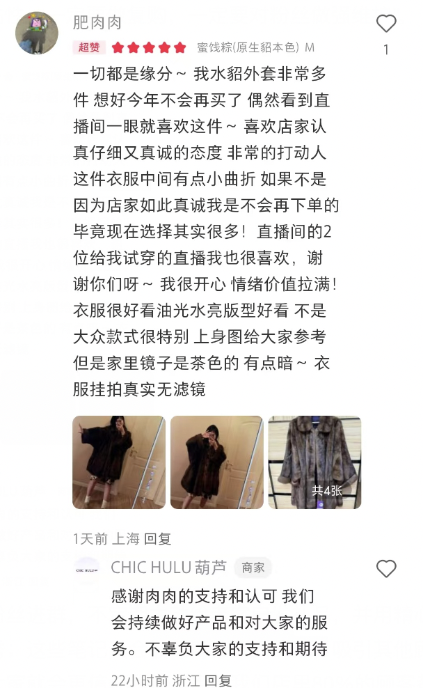 他們開始籌備的時(shí)候就發(fā)現(xiàn),小紅書消費(fèi)者對(duì)皮草的審美已經(jīng)從極簡(jiǎn)轉(zhuǎn)向“大嫂”式富貴中古風(fēng)。制作產(chǎn)品時(shí),他們一度擔(dān)心太富貴的款式會(huì)很“勸退”,但本次夏秋換季一發(fā)售,“發(fā)現(xiàn)消費(fèi)者巨喜歡”。CHIC HULU最近的一個(gè)爆款,主打的就是富貴逼人。
