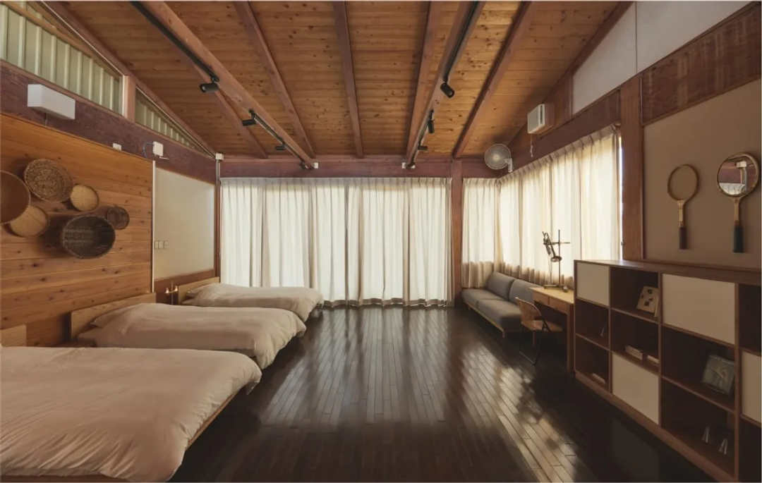 在房屋 A 中,寬敞的客房由一間教室改造而成,仍然保留了教室的大開間設計,極具開放感,適合團體入住或作為舉辦工作坊和團建活動的空間。