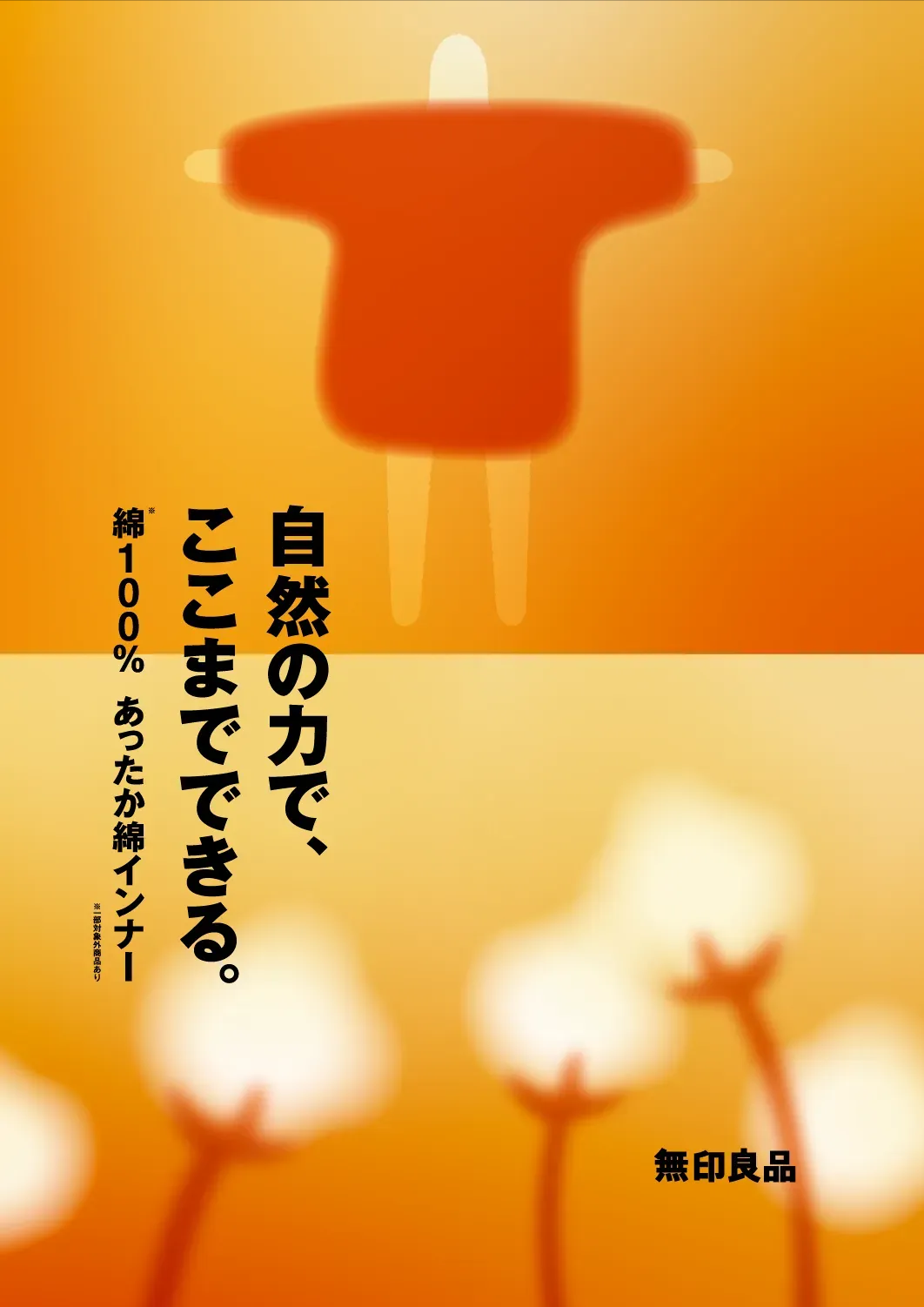 眾所周知,原研哉在設計中重視“空”與“白”,尤其是對于無印良品的設計,更是將極簡主義發揮到極致。2024年冬季系列的主視覺,海報采用了橙色到黃色的漸變色背景,從下到上顏色由淺到深。這種溫暖的色調傳達了溫暖、舒適的感覺,與冬季保暖內衣的產品定位相契合。