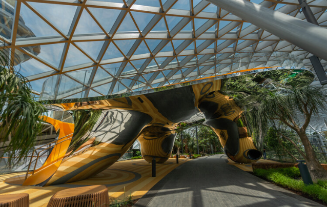 機場設計模仿了新加坡的“花園式”氛圍,有助于人們感知新加坡這座城市。位于第五層的 Canopy Park 包括 14,000 平方米的景點,這些景點與花園空間融為一體。這些景點包括懸掛在樹上的網狀結構、懸空的玻璃底橋步道、綠植籬笆迷宮和鏡子迷宮,以及與國際知名藝術家合作完成的特色裝置。