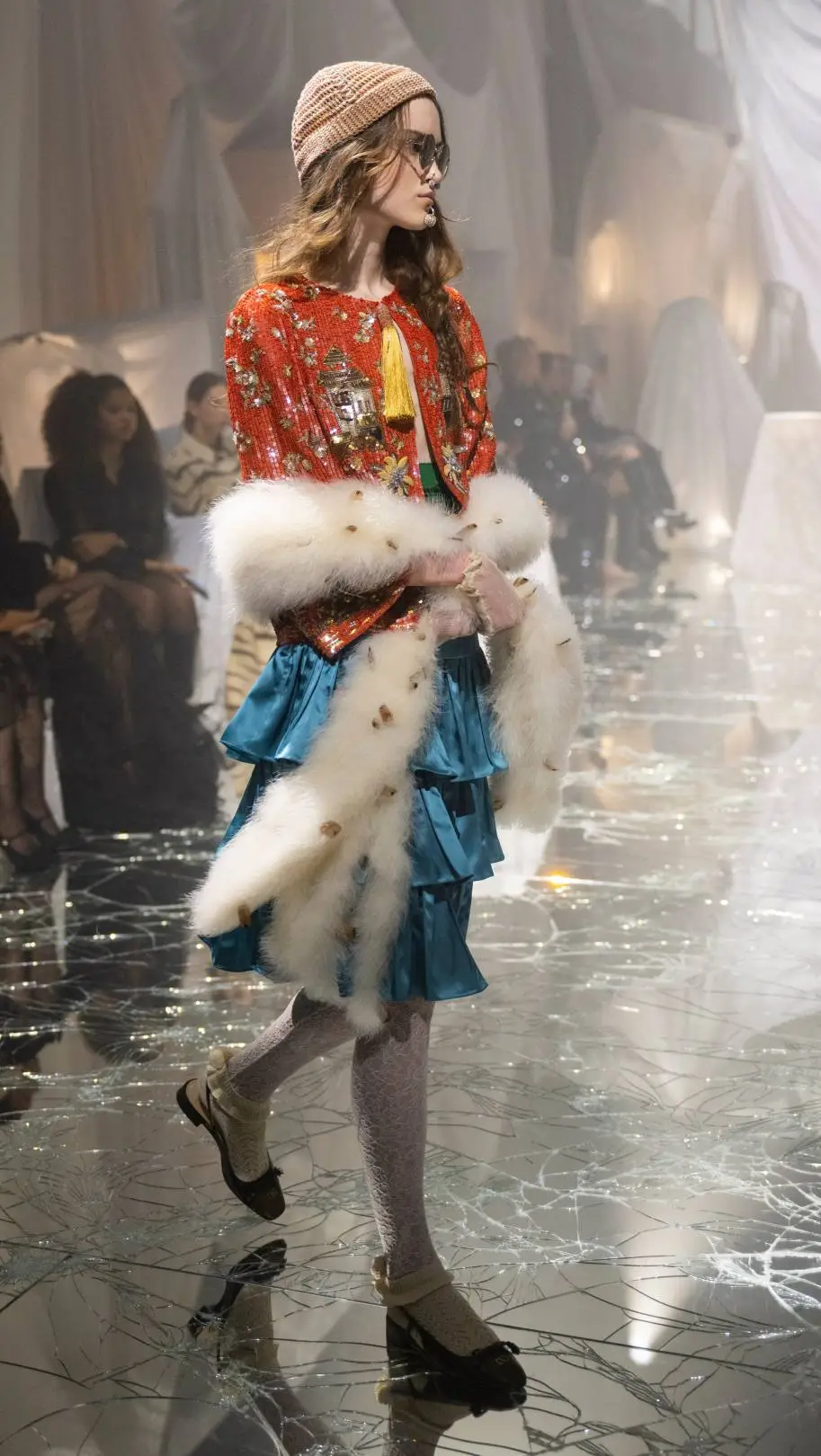 復古華麗的風格,洋溢著極繁主義天馬行空的想象力:層疊的褶邊、皮草披肩和裙擺的點綴、蕾絲與華麗刺繡的碰撞。
