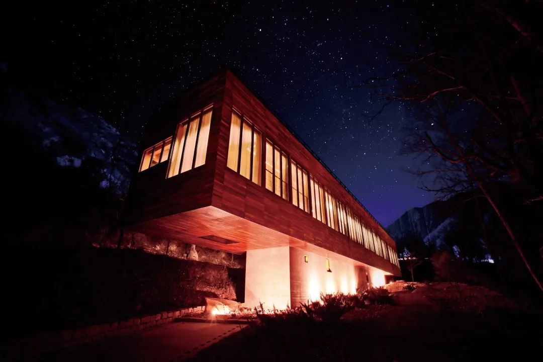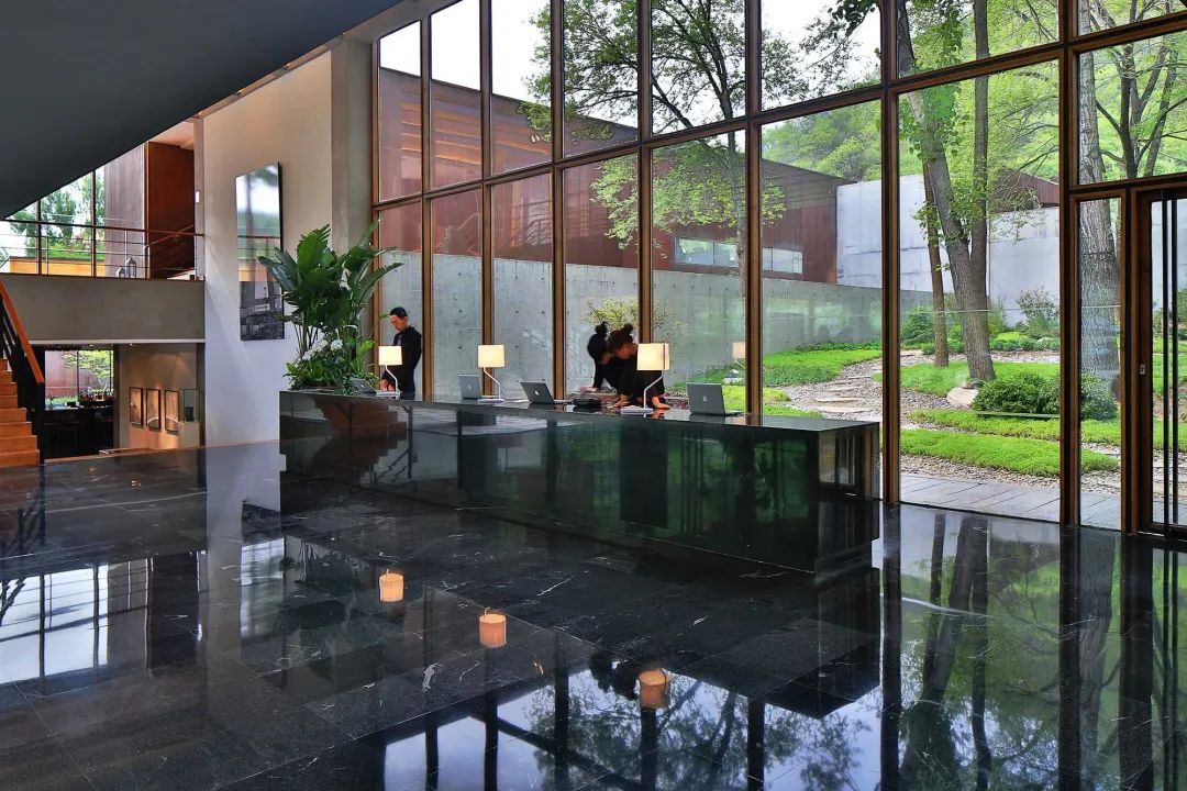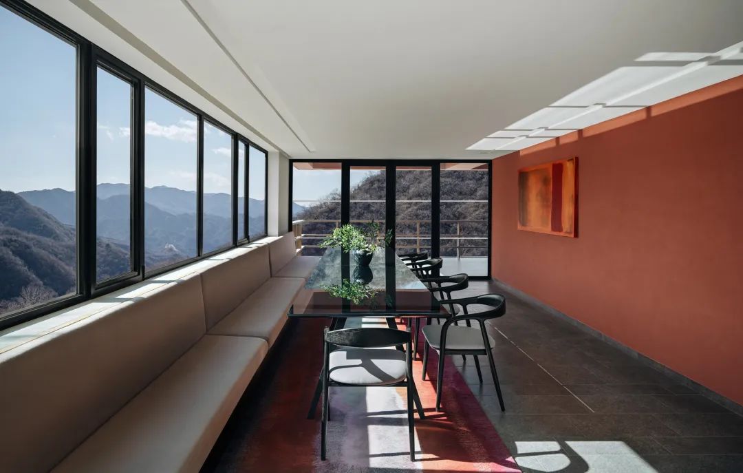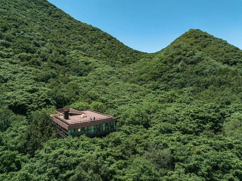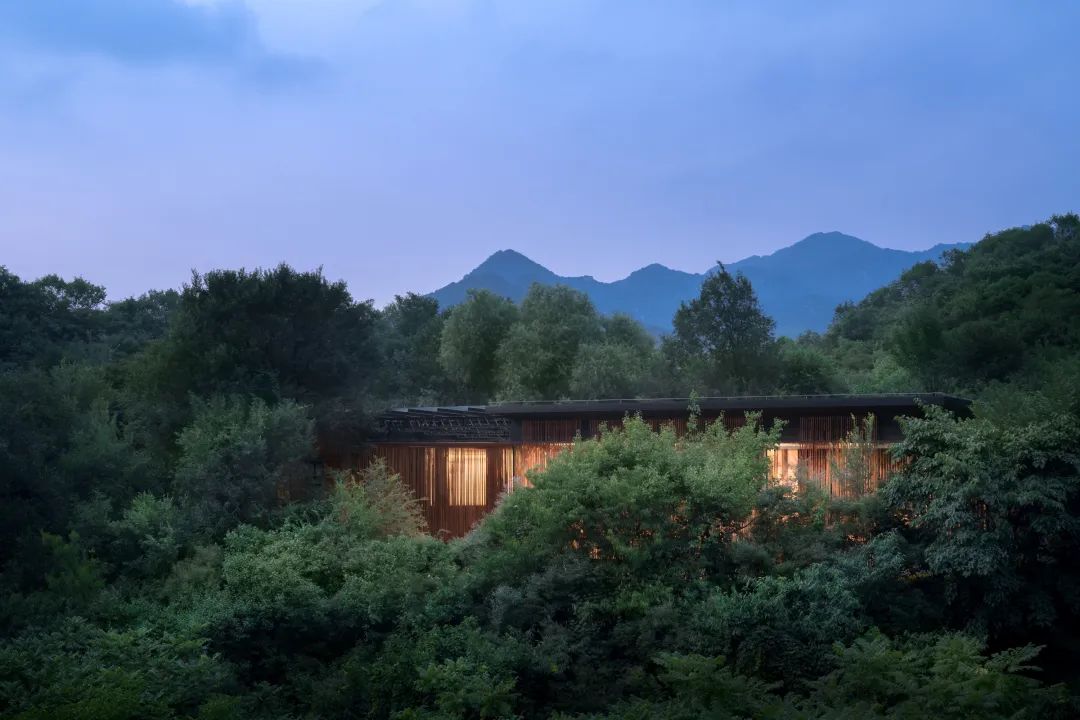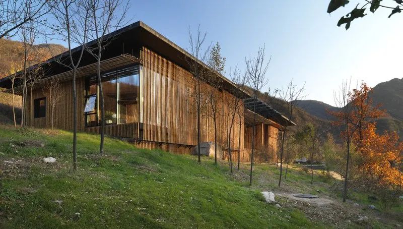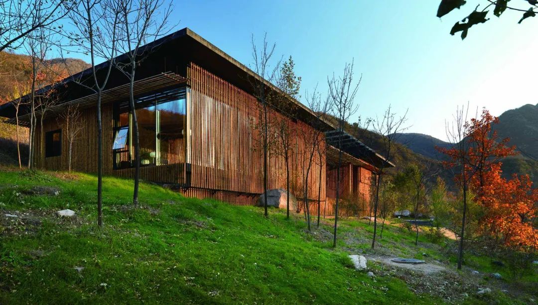 由于限制較小,在高自由度的設(shè)計(jì)暢想中,我們能在每棟建筑中看到設(shè)計(jì)師對(duì)人與自然的思考,建筑大多數(shù)采用落地玻璃、竹材、原木等材料,與長(zhǎng)城腳下山間自然風(fēng)貌相呼應(yīng)。