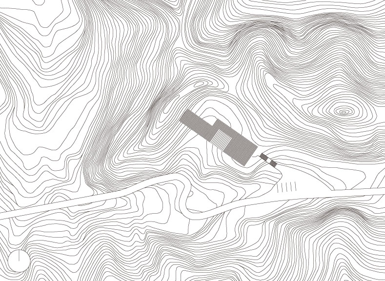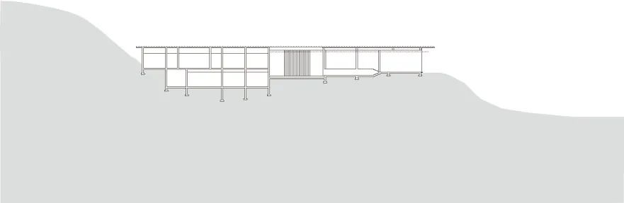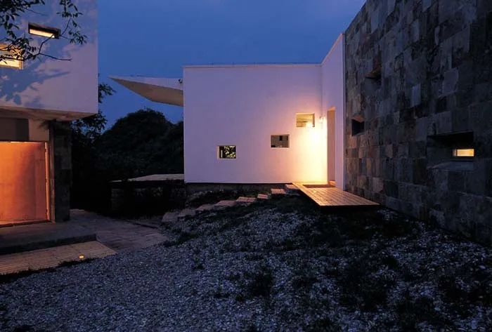 將當(dāng)?shù)氐氖淖鳛橹饕牧?,是住宅設(shè)計(jì)得與所處的自然涵構(gòu)密切的結(jié)合的原因。住宅的體量是以一個(gè)較大的建筑物與一個(gè)較小的附件配置于山谷的基地當(dāng)中,兩者者是L字形,這有助于前述的結(jié)合。