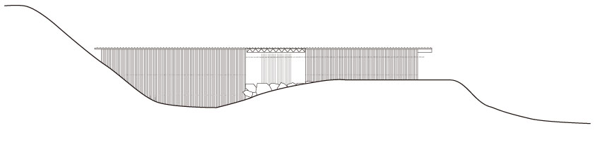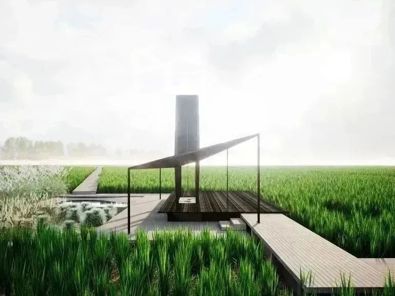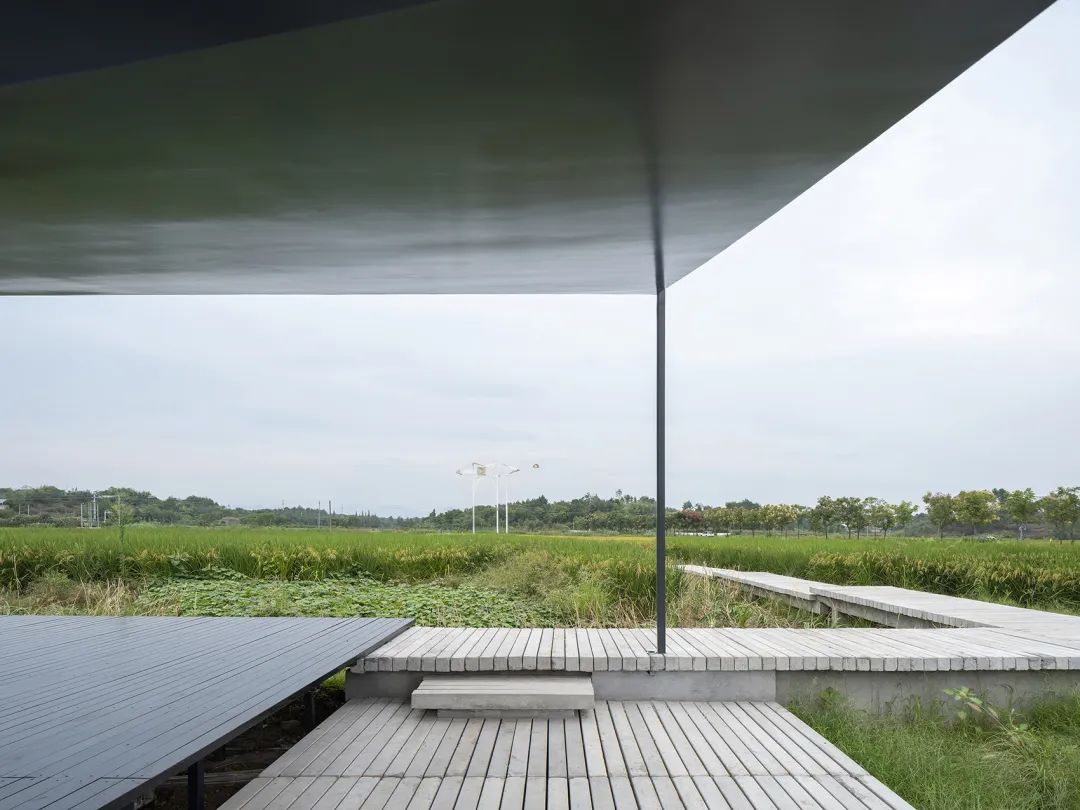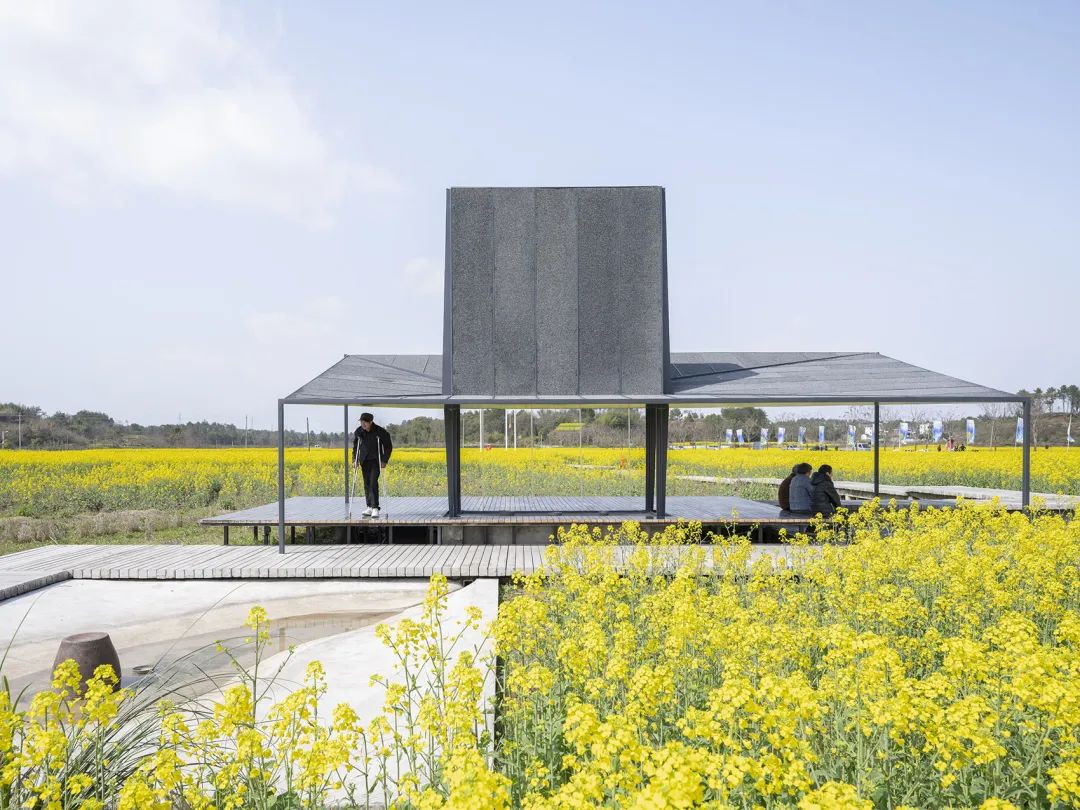 深入農(nóng)田里的灌溉渠像是大地上的標(biāo)尺,標(biāo)示出一個(gè)特定的高度——走在水渠上穿越金色的油菜花,建筑師決定在水渠端頭創(chuàng)造一個(gè)特別的場(chǎng)所。