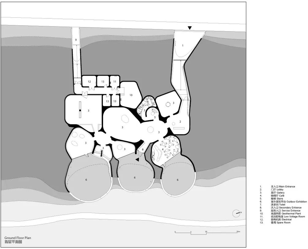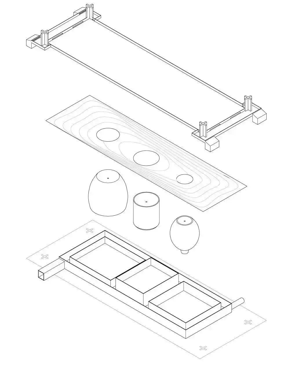 在場(chǎng)所的中心是一個(gè)隱匿的精神性垂直空間,它作為這個(gè)結(jié)構(gòu)體的力學(xué)核心,隱藏了一個(gè)滴水埋甕的古法聲音裝置,從而建立起天空與大地的聯(lián)系。