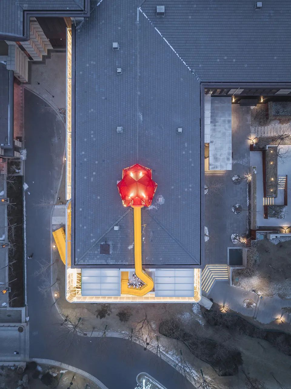 整個(gè)餐廳最重要的高潮是屋頂上用雙層穿孔鋁板建造的紅色飛屋,沿著黃色的線(xiàn)索,經(jīng)過(guò)一個(gè)不銹鋼的水面,繞過(guò)泡泡樹(shù),曲折走向屋脊,光線(xiàn)越來(lái)越亮。