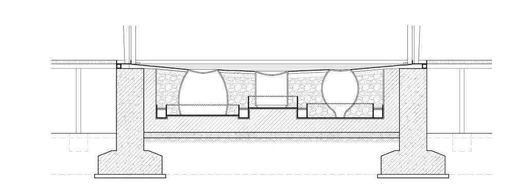 屋面收集的雨水順著十字柱流下、最終導(dǎo)向一塊弧形的水泥基座——三個(gè)老水缸的圓形底部鑲嵌其上,如同遺跡般喚起人們對(duì)鄉(xiāng)村生活的記憶。