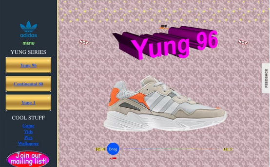 阿迪達斯為Yung 96系列打造的復古網站(1996年風格)(圖片來源:阿迪達斯)
