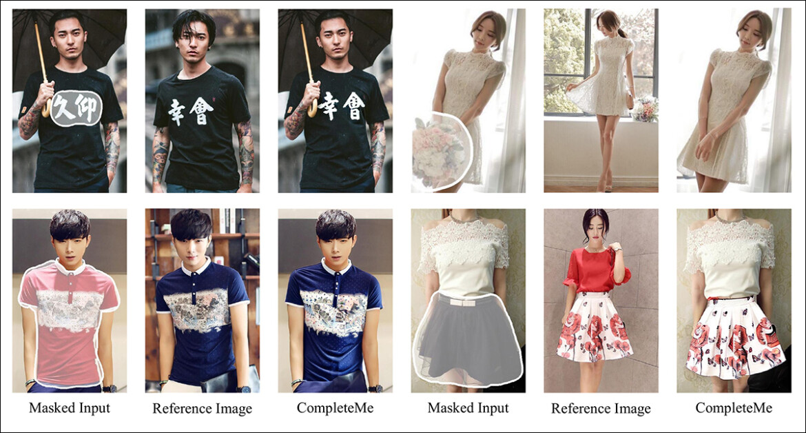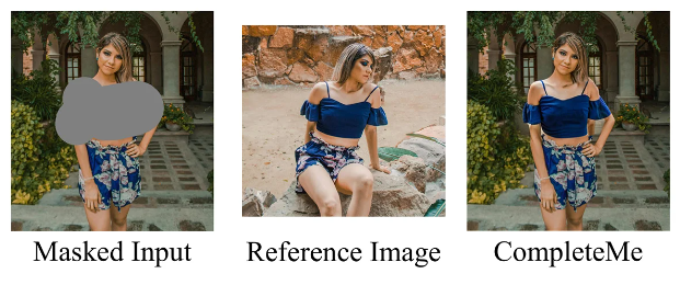CompleteMe系統(tǒng)通過參考圖像(中列)為原始圖像(左列)生成自然逼真的補全效果(右列)。案例來自論文補充材料:查看詳情