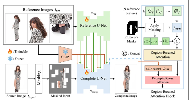 這項發(fā)表于arXiv的研究采用雙U-Net架構(gòu)與區(qū)域聚焦注意力模塊(RFA),通過參考圖像指導系統(tǒng)修復被遮擋的人體部位:
