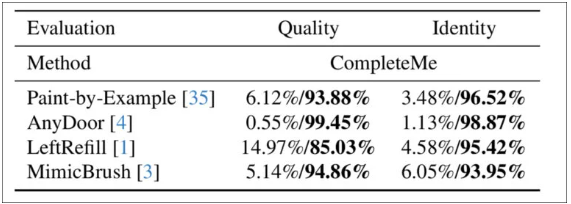 用戶研究顯示,在2895組對比測試中,CompleteMe生成的圖像在視覺質(zhì)量和特征保真度上獲得顯著偏好: