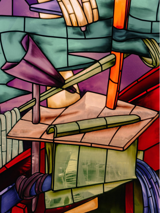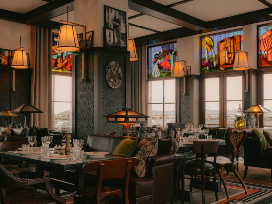 一樓的La Cuisine de Rose啤酒屋與At Rose酒吧,以淡粉為主調配搭炭黑家具,天花懸垂巨型折紙飛機,訴說著曼弗雷德對妻子的愛意。鑲嵌在宅邸中的La Maison de Manfred餐廳,則通過彩繪玻璃延續這個主題。"這些彩繪玻璃邀請人們進入可居住的概念藝術品核心,"斯塔克的藝術家女兒阿拉解釋道,"它們活化空間,將城市歷史符號與超現實主義意象鐫刻其中,隨光線變幻如整日交錯的全息圖景。"