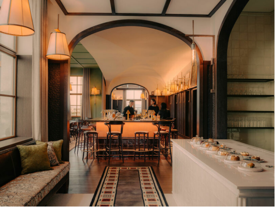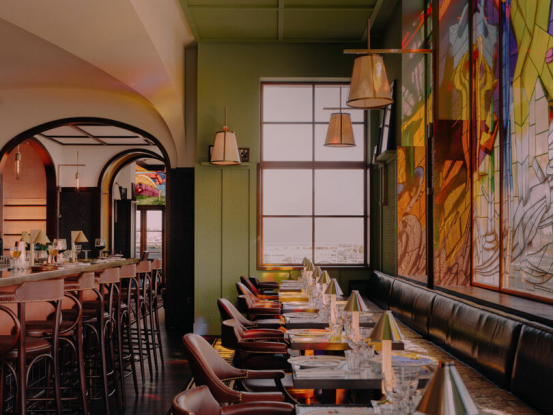 這個充滿家族記憶的"舊世界"空間,配置了絨面長椅、厚重古董扶手椅與重構的維多利亞圖案,被景觀露臺與蔥郁屋頂花園環繞。墨綠色浮雕皮革包裹立柱,深色陶土磚覆蓋墻面。相鄰的Manfred's Bar則致敬第二次工業革命的機械發明,實驗性雞尾酒與化學儀器般的設計細節延續著創新主題。