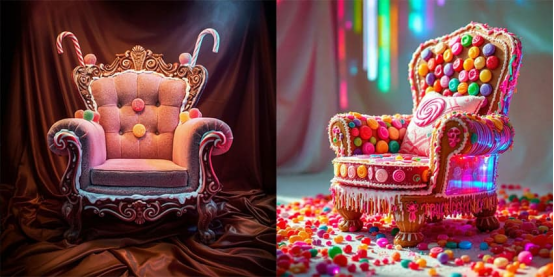 糖果制成的扶手椅,姜餅框架,甘草鑲邊,小熊軟糖坐墊,棒棒糖裝飾,糖玻璃細節,柔和的彩色光線照明,奇幻場景,甜點仙境,高清畫質,鮮艷色彩。
