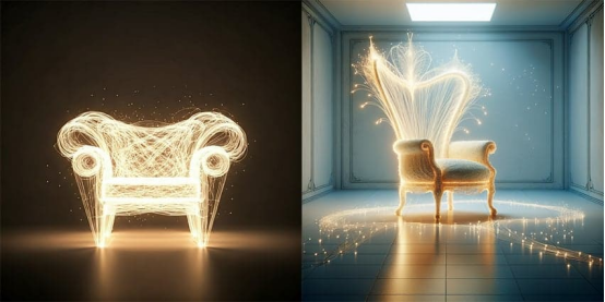 由璀璨光線構成的空靈扶手椅,精妙設計,發光細絲,柔和照明,漂浮微粒,置于極簡白色房間,營造超現實而溫馨的氛圍,沐浴在溫柔暖光中。