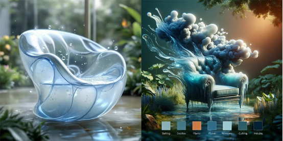 半透明雨水雕琢的空靈扶手椅,倒映著柔和的陰霾天空。椅子泛著精致的藍灰色調,捕捉水流瞬息萬變的本質。縷縷水霧繚繞其形,背景是朦朧的蔥郁花園。