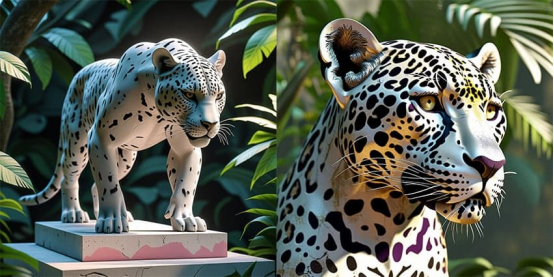 混凝土捷豹雕塑,力量感姿態,叢林環境,斑駁陽光,綠色植被背景,強烈陰影,逼真紋理。