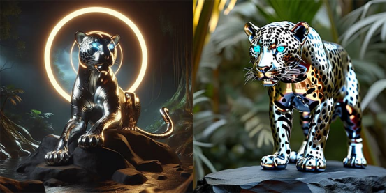 金屬捷豹雕塑,光滑鍍鉻表面,發光的藍色眼睛,立于黑色巖石上,叢林背景,立體燈光,細致紋理,超現實主義。